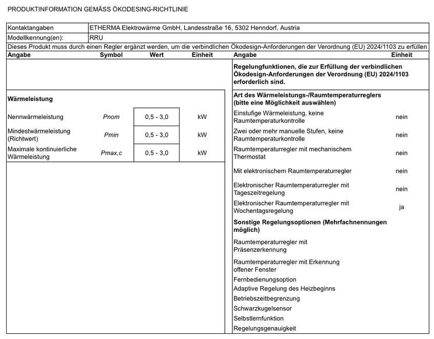 Bei diesem Produkt handelt es sich um ein ortsfestes, elektrisches Einzelraumheizgerät mit einer Nennwärmeleistung von mehr als 250W; um die verbindlichen Ökodesign Anforderungen der Verordnung (EU) 2024/1103 der Kommission zu erfüllen, muss es durch einen Regler ergänzt werden, der mindestens die folgenden Regelungsfunktionen erfüllt: elektronischer Raumtemperaturregler mit Wochentagsregelung (TW) und mindestens eine f-Funktion (z.B. f2, f4 oder f8), folgende Kombinationen sind möglich: TW (f2), TW (f3), TW (f8)