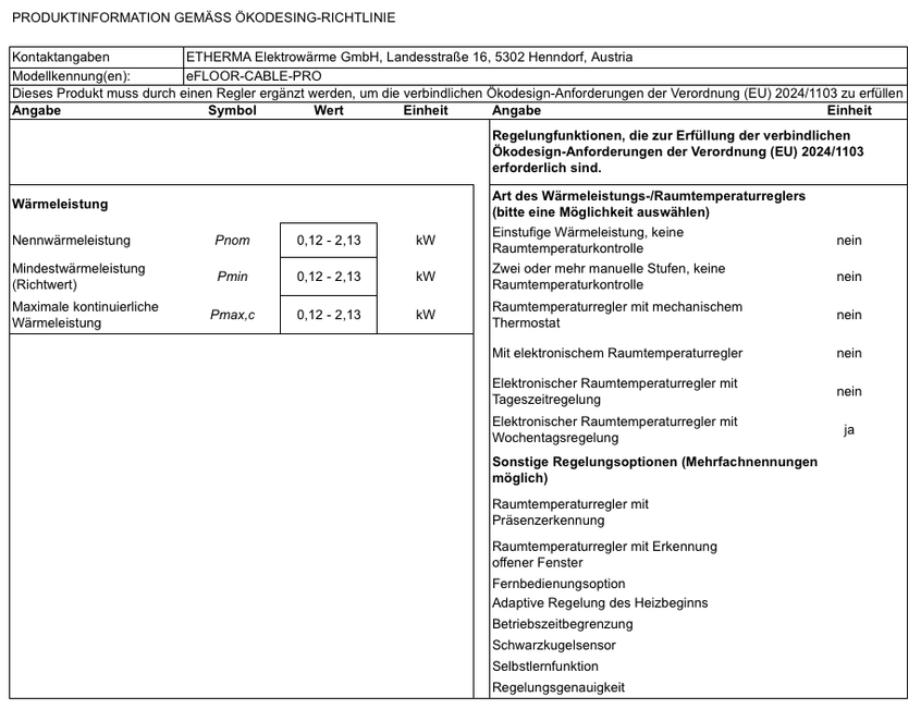 Bei diesem Produkt handelt es sich um ein ortsfestes, elektrisches Fußboden-Einzelraumheizgerät; um die verbindlichen Ökodesign Anforderungen der Verordnung (EU) 2024/1103 der Kommission zu erfüllen, muss es durch einen Regler ergänzt werden, der mindestens die folgenden Regelungsfunktionen erfüllt: elektronischer Raumtemperaturregler mit Wochentagsregelung (TW) und mindestens eine f-Funktion (z.B. f2 oder f4), folgende Kombinationen sind möglich: TW (f2), TW (f3), TW (f4), TW (f8)