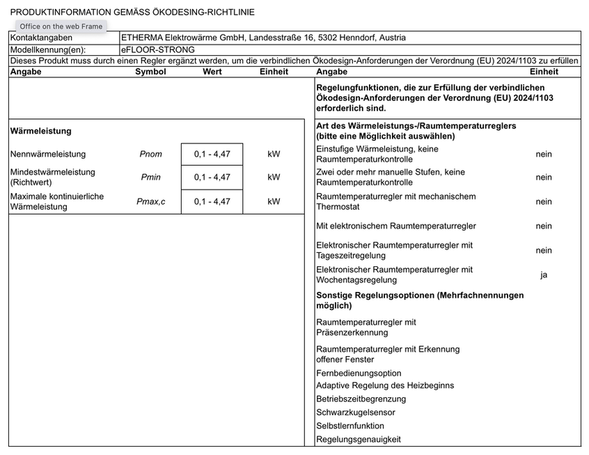 Bei diesem Produkt handelt es sich um ein ortsfestes, elektrisches Fußboden-Einzelraumheizgerät; um die verbindlichen Ökodesign Anforderungen der Verordnung (EU) 2024/1103 der Kommission zu erfüllen, muss es durch einen Regler ergänzt werden, der mindestens die folgenden Regelungsfunktionen erfüllt: elektronischer Raumtemperaturregler mit Wochentagsregelung (TW) und mindestens eine f-Funktion (z.B. f2 oder f4), folgende Kombinationen sind möglich: TW (f2), TW (f3), TW (f4), TW (f8)