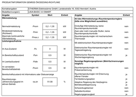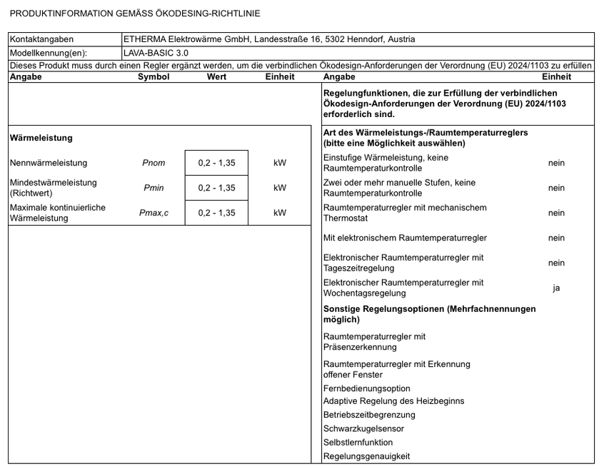 Bei diesem Produkt handelt es sich um ein ortsfestes, elektrisches Einzelraumheizgerät mit einer Nennwärmeleistung von mehr als 250W; um die verbindlichen Ökodesign Anforderungen der Verordnung (EU) 2024/1103 der Kommission zu erfüllen, muss es durch einen Regler ergänzt werden, der mindestens die folgenden Regelungsfunktionen erfüllt: elektronischer Raumtemperaturregler mit Wochentagsregelung (TW) und mindestens eine f-Funktion (z.B. f2, f4 oder f8), folgende Kombinationen sind möglich: TW (f2), TW (f3), TW (f8)