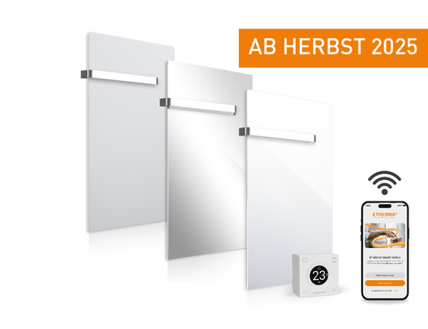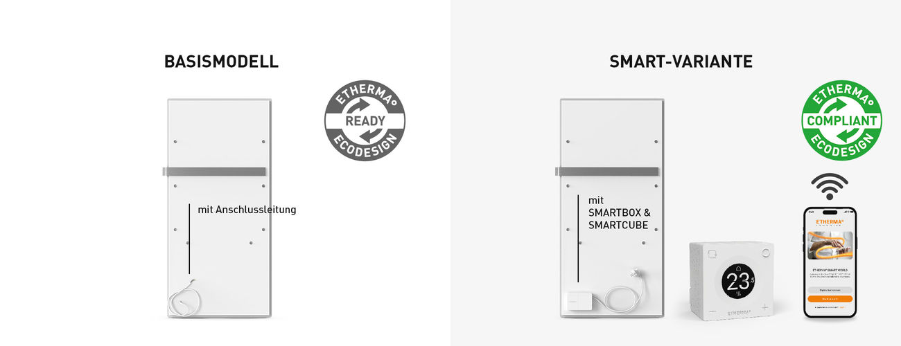 Das Basismodell kann jederzeit mit dem SMARTSET - bestehend aus SMARTBOX (Funkempfänger) und SMARTCUBE (Thermostat) - zur SMART-Variante aufgerüstet werden. So steuern Sie Ihre Infrarotheizung bequem per ETHERMA SMART App über WiFi - für maximale Kontrolle, Energieeffizienz und Komfort. -