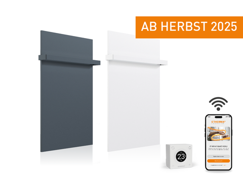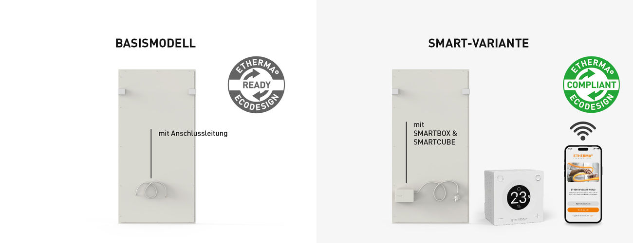 Das Basismodell kann jederzeit mit dem SMARTSET - bestehend aus SMARTBOX (Funkempfänger) und SMARTCUBE (Thermostat) - zur SMART-Variante aufgerüstet werden. So steuern Sie Ihre Infrarotheizung bequem per ETHERMA SMART App über WiFi - für maximale Kontrolle, Energieeffizienz und Komfort. -