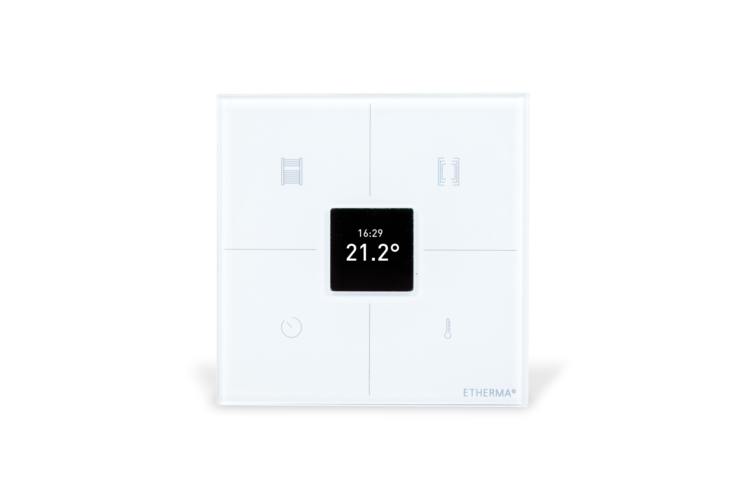 Typ: eTOUCH-hybrideTOUCH hybrid ist das neueste Design-Einbauthermostat von ETHERMA, das sich durch die energieeinsparende Selbstlernfunktion, besondere Bedienerfreundlichkeit und das elegante Infinity Design auszeichnet. Der Regler verfügt über ein hochwertiges LED-Glas-Touchdisplay und kann dank zwei Relaisausgängen gleichzeitig 2 Heizungen steuern - jeweils wahlweise mit Timerfunktion (bis zu 3h) oder Wochenprogrammierung . Es ist zudem Ökodesign-Richtlinien konform. Farbe: weiß, Maße: 90x90 mm, Temperaturbereich: 18-27 °C, Schaltstrom: 16 A total, Spannung: 230 V, Gangreserve: Zeiteinstellung 3 min., Montage: auf UP-Schalterdose, Schutzart: IP 21, Prüfzeichen: CE konform. Dieser Regler erfüllt folgende Regelungsfunktionen: TW (f4)