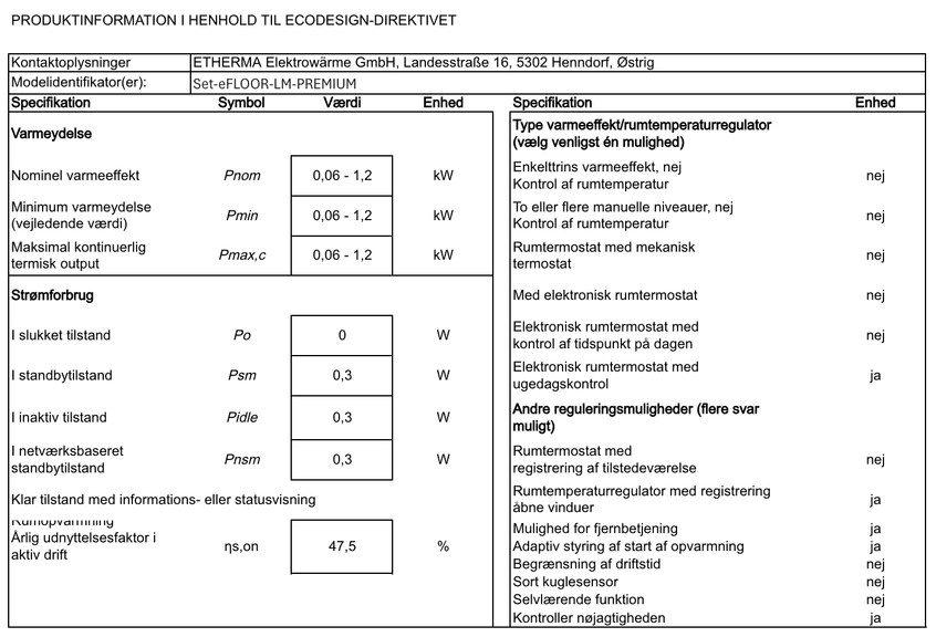 Dette produkt er et stationært, elektrisk gulvvarmeapparat til et enkelt rum. For at opfylde de obligatoriske krav til miljøvenligt design i Ecodesign-forordningen (EU) 2024/1103 skal det suppleres med en regulator, der mindst opfylder følgende kontrolfunktioner: elektronisk rumtemperaturregulator med ugedagsstyring (TW) og mindst én f-funktion (f.eks. f2, f4 eller f8), følgende kombinationer er mulige: TW (f2), TW (f3), TW (f4), TW (f8).