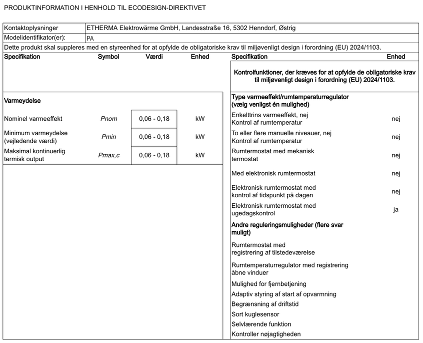 Dette produkt er et stationært, elektrisk gulvvarmeapparat til et enkelt rum. For at opfylde de obligatoriske krav til miljøvenligt design i Ecodesign-forordningen (EU) 2024/1103 skal det suppleres med en regulator, der mindst opfylder følgende kontrolfunktioner: elektronisk rumtemperaturregulator med ugedagsstyring (TW) og mindst én f-funktion (f.eks. f2 eller f4), følgende kombinationer er mulige: TW (f2), TW (f3), TW (f4), TW (f8).