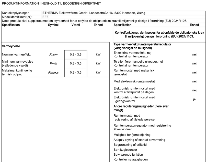 Dette produkt er et stationært, elektrisk varmeapparat til et enkelt rum med en nominel varmeeffekt på mere end 250 W; for at opfylde de obligatoriske krav til miljøvenligt design i Ecodesign-forordningen (EU) 2024/1103 skal det suppleres med en regulator, der mindst opfylder følgende kontrolfunktioner: elektronisk rumtemperaturregulator med ugedagsstyring (TW) og mindst én f-funktion (f.eks. f2, f4 eller f8), følgende kombinationer er mulige: TW (f2), TW (f3), TW (f8).