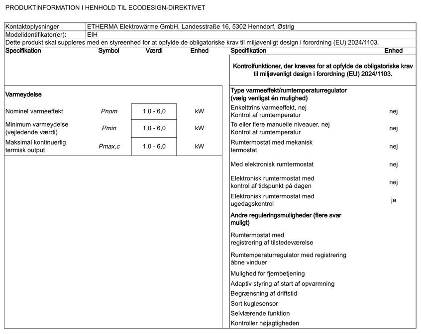 Dette produkt er et stationært, elektrisk varmeapparat til et enkelt rum med en nominel varmeeffekt på mere end 250 W; for at opfylde de obligatoriske krav til miljøvenligt design i Ecodesign-forordningen (EU) 2024/1103 skal det suppleres med en regulator, der mindst opfylder følgende kontrolfunktioner: elektronisk rumtemperaturregulator med ugedagsstyring (TW) og mindst én f-funktion (f.eks. f2, f4 eller f8), følgende kombinationer er mulige: TW (f2), TW (f3), TW (f8).