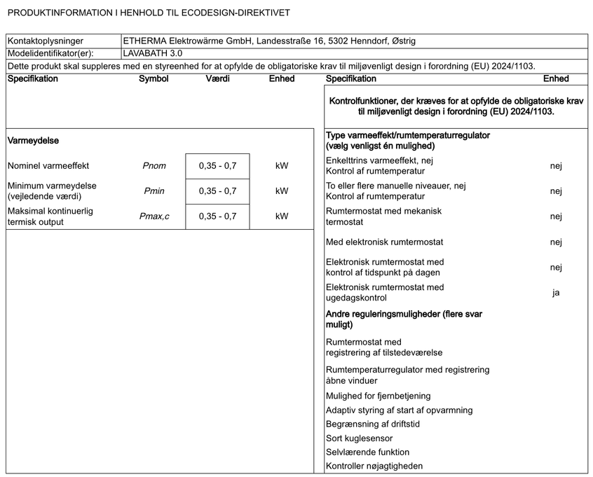 Dette produkt er en håndklædestang med en nominel varmeeffekt på mere end 250 W; for at opfylde de obligatoriske krav til miljøvenligt design i Kommissionens forordning (EU) 2024/1103 skal det suppleres med en styring, der mindst opfylder følgende styringsfunktioner: elektronisk rumtemperaturstyring med ugedagsstyring (TW).