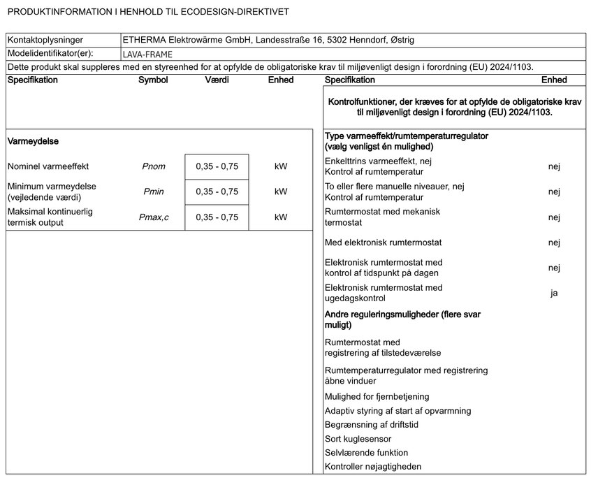 Dette produkt er en stationær, elektrisk enkeltrumsvarmer med en nominel varmeeffekt på mere end 250 W. For at opfylde de obligatoriske krav til miljøvenligt design i Ecodesign-forordningen (EU) 2024/1103 skal det suppleres med en regulator, der mindst opfylder følgende kontrolfunktioner: elektronisk rumtemperaturregulator med ugedagsregulering (TW) og mindst én f-funktion (f.eks. f2, f4 eller f8), følgende kombinationer er mulige: TW (f2), TW (f3), TW (f8).