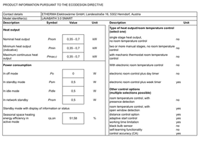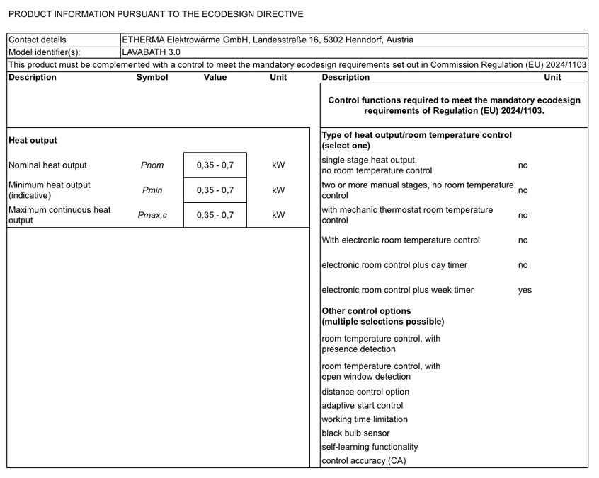 This product is a towel rail with a nominal heat output of more than 250W; in order to meet the mandatory ecodesign requirements of Commission Regulation (EU) 2024/1103, it must be supplemented by a controller that fulfills at least the following control functions: electronic room temperature controller with weekday control (TW)