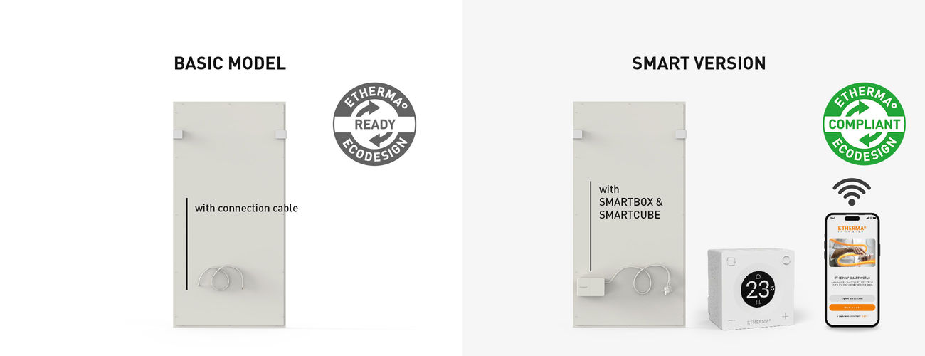 The basic model can be upgraded to the SMART version at any time with the SMART SET - consisting of SMARTBOX (radio receiver) and SMARTCUBE (thermostat). This allows you to conveniently control your infrared heater using the ETHERMA SMART app via WiFi - for maximum control, energy efficiency and convenience.Optimum heat radiation