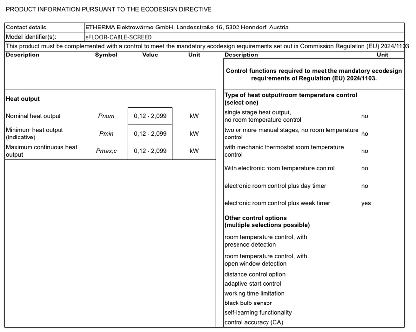 This product is a fixed, electric underfloor single-room heating appliance; in order to meet the mandatory ecodesign requirements of Commission Regulation (EU) 2024/1103, it must be supplemented by a controller that fulfills at least the following control functions: electronic room temperature controller with weekday control (TW) and at least one f function (e.g. f2 or f4), the following combinations are possible: TW (f2), TW (f3), TW (f4), TW (f8)