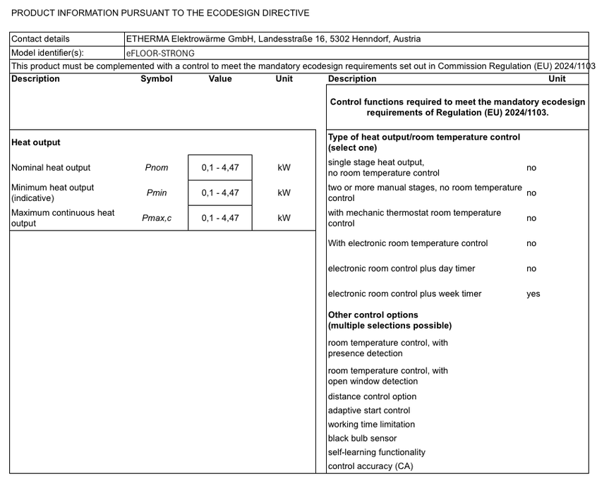 This product is a fixed, electric underfloor single-room heating appliance; in order to meet the mandatory ecodesign requirements of Commission Regulation (EU) 2024/1103, it must be supplemented by a controller that fulfills at least the following control functions: electronic room temperature controller with weekday control (TW) and at least one f function (e.g. f2 or f4), the following combinations are possible: TW (f2), TW (f3), TW (f4), TW (f8)