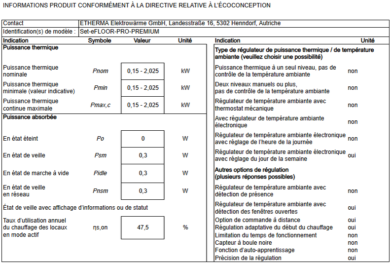 Ce produit est un appareil de chauffage électrique au sol fixe destiné à une seule pièce ; afin de satisfaire aux exigences obligatoires en matière d'écoconception de la réglementation (UE) 2024/1103 de la Commission, il doit être complété par un régulateur qui remplit au moins les fonctions de régulation suivantes : régulateur électronique de température ambiante avec régulation hebdomadaire (TW) et au moins une fonction f (par exemple f2 ou f4), les combinaisons suivantes sont possibles : TW (f2), TW (f3), TW (f4), TW (f8)