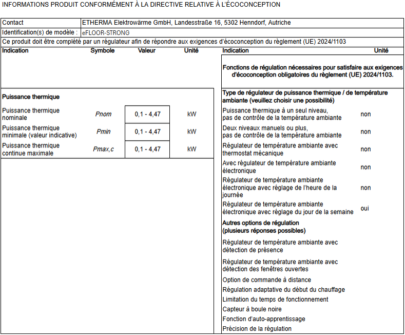Ce produit est un appareil de chauffage électrique au sol fixe destiné à une seule pièce. Afin de satisfaire aux exigences obligatoires en matière d'écoconception de la réglementation (UE) 2024/1103 de la Commission, il doit être complété par un régulateur qui remplit au moins les fonctions de régulation suivantes : régulateur électronique de température ambiante avec régulation hebdomadaire (TW) et au moins une fonction f (par exemple f2 ou f4), les combinaisons suivantes sont possibles : TW (f2), TW (f3), TW (f4), TW (f8)