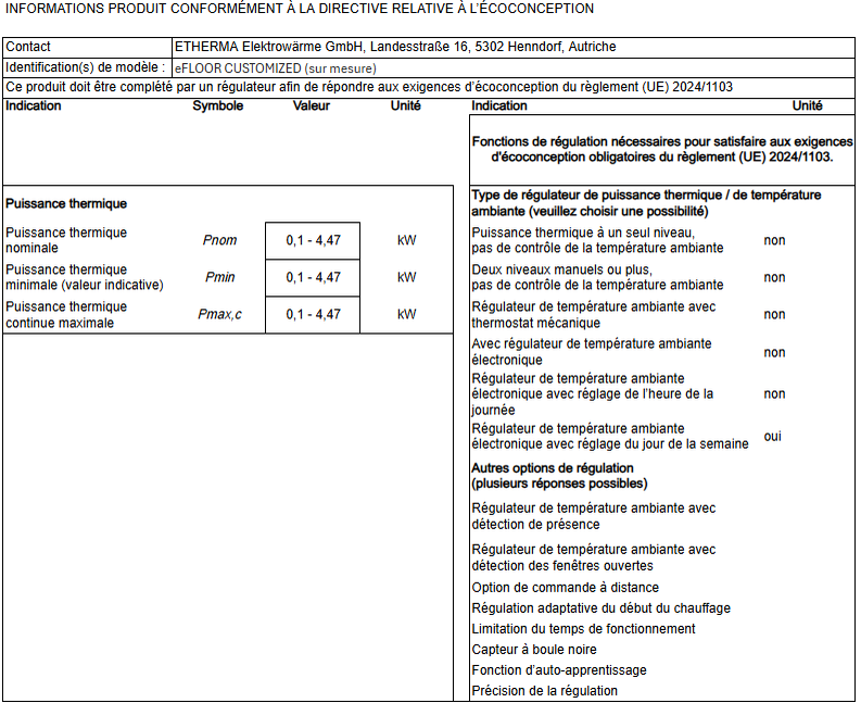 Ce produit est un appareil de chauffage électrique au sol fixe destiné à une seule pièce. Afin de satisfaire aux exigences obligatoires en matière d'écoconception du règlement (UE) 2024/1103 de la Commission, il doit être complété par un régulateur qui remplit au moins les fonctions de régulation suivantes : régulateur électronique de température ambiante avec réglage hebdomadaire (TW) et au moins une fonction f (par exemple f2 ou f4), les combinaisons suivantes sont possibles : TW (f2), TW (f3), TW (f4), TW (f8)