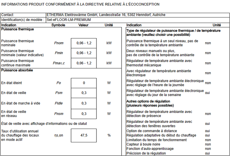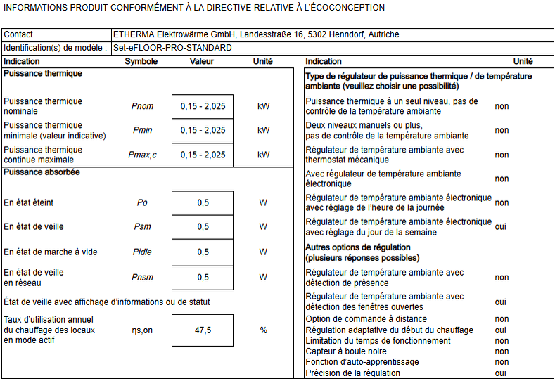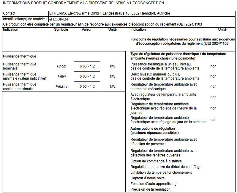 Ce produit est un appareil de chauffage électrique au sol fixe destiné à une seule pièce. Afin de satisfaire aux exigences obligatoires en matière d'écoconception de la réglementation (UE) 2024/1103 de la Commission, il doit être complété par un régulateur qui remplit au moins les fonctions de régulation suivantes : régulateur électronique de température ambiante avec régulation hebdomadaire (TW) et au moins une fonction f (par exemple f2 ou f4), les combinaisons suivantes sont possibles : TW (f2), TW (f3), TW (f4), TW (f8)