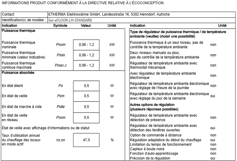 Ce produit est un appareil de chauffage électrique au sol fixe destiné à une seule pièce ; afin de satisfaire aux exigences obligatoires en matière d'écoconception de la réglementation (UE) 2024/1103 de la Commission, il doit être complété par un régulateur qui remplit au moins les fonctions de régulation suivantes : régulateur électronique de température ambiante avec régulation hebdomadaire (TW) et au moins une fonction f (par exemple f2 ou f4), les combinaisons suivantes sont possibles : TW (f2), TW (f3), TW (f4), TW (f8)