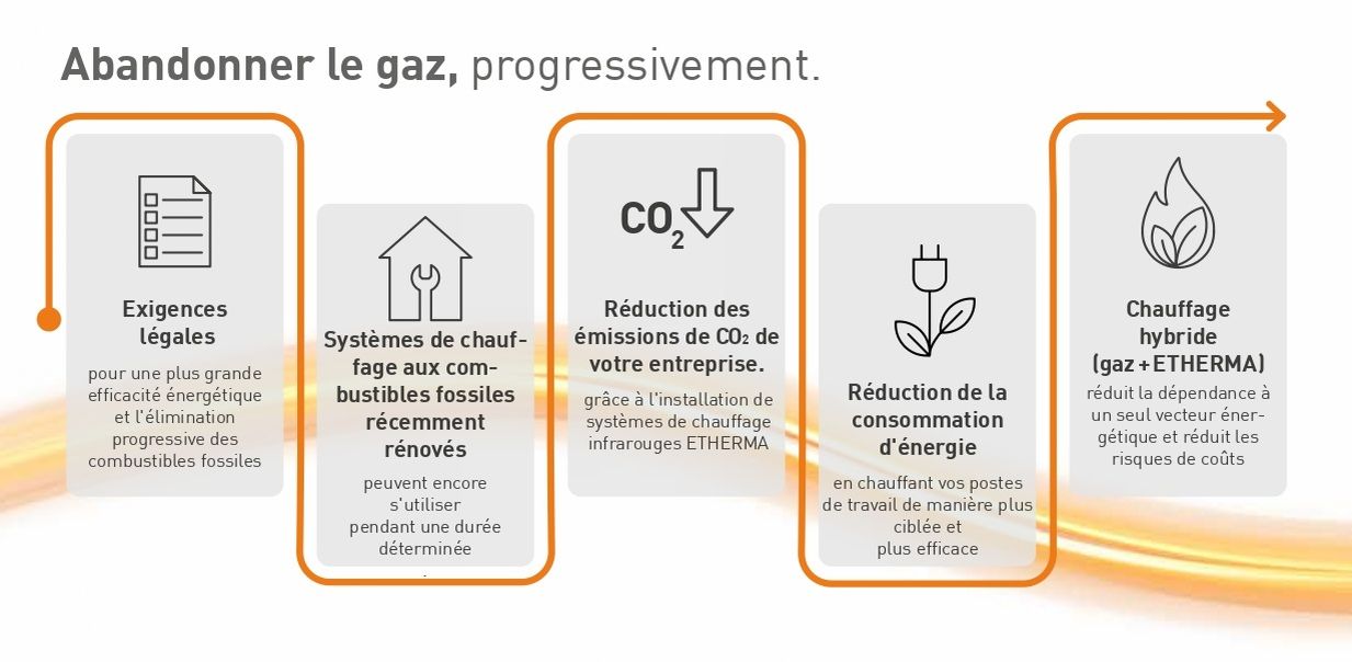 Dans les grands halls notamment, il est souvent impossible ou tout simplement trop coûteux de chauffer toute la surface. ETHERMA a la solution idéale : un chauffage ponctuel ou par zone avec un système de chauffage infrarouge. Vous ne chauffez ainsi que les zones réellement nécessaires et vos collaborateurs bénéficient d'une chaleur agréable et constante.