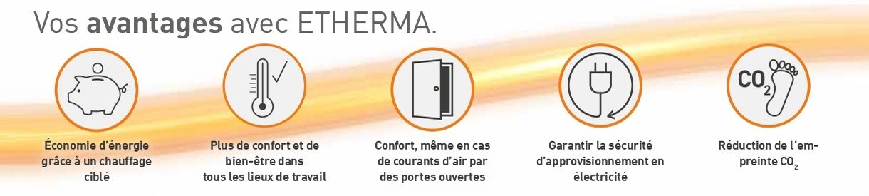Avec ETHERMA, vous pouvez respecter toutes les réglementations tout en réduisant la température ambiante et donc la consommation d'énergie, tandis que vos collaborateurs se sentent parfaitement à l'aise grâce à la chaleur rayonnante agréable.