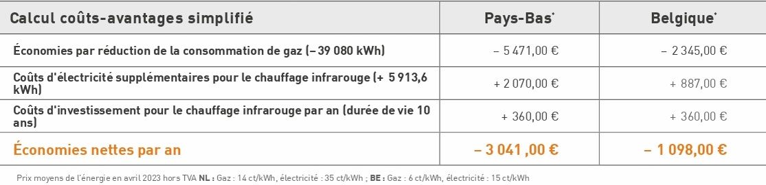 Le test de Bedford et Liese le confirme : lorsque les murs sont chauds, les gens ressentent le même confort, malgré une température ambiante plus basse. La température subjective est de 2 à 3 °C supérieure à la température réelle. Il est ainsi possible de réduire la température ambiante sans perte de confort. Chaque degré en moins permet d'économiser environ 6 % d'énergie. La chaleur infrarouge permet donc d'économiser jusqu'à 18 % d'énergie.