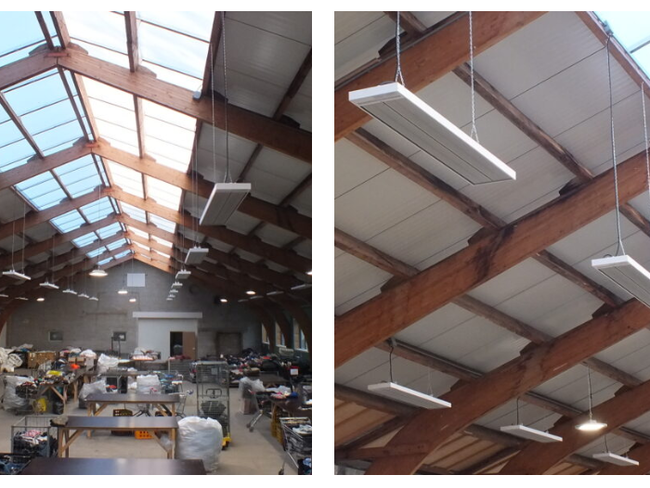 Dans ce centre régional de tri textile, la poussière soulevée par le chauffage au gaz provoquait régulièrement des problèmes de santé chez les employés. La solution d'ETHERMA consistait à installer 28 radiateurs infrarouges EEZ-2000 d'une puissance totale de 56 kW. La température dans la pièce reste ainsi agréable pour tous les employés, sans que la poussière ne circule dans le hall. ETHERMA a également conçu le tableau de commande et un plan d'installation détaillé afin de garantir un montage rapide et sans problème.