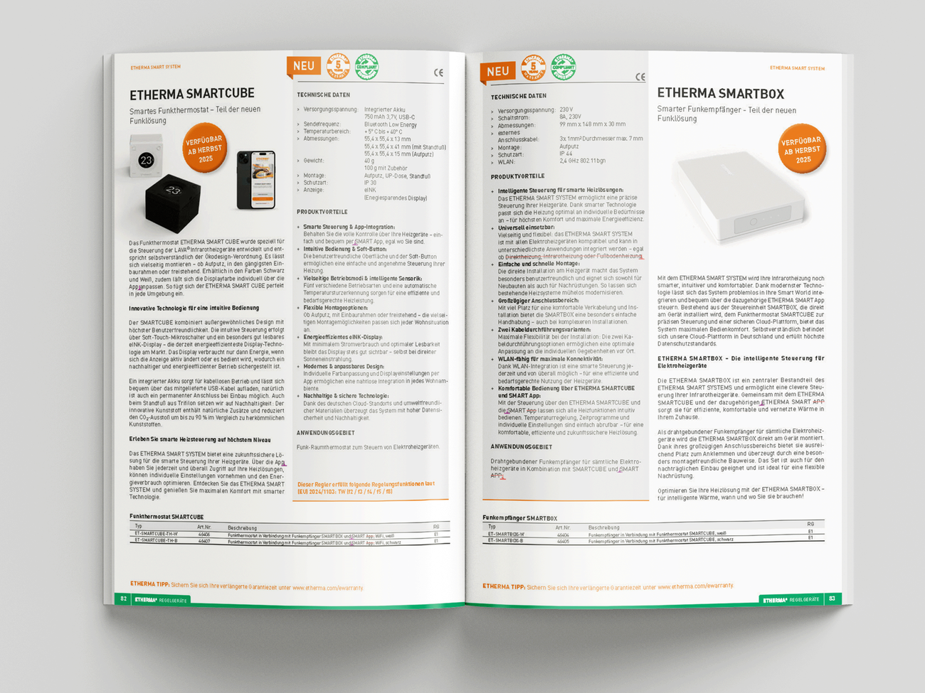 Le nouveau catalogue de produits ETHERMA 2025/26 ne présente pas seulement des produits, mais aussi des perspectives. Pour une construction économe en énergie, des concepts d'habitat intelligents et un chauffage durable à l'électricité. Découvrez comment les systèmes de chauffage électriques modernes apportent dès aujourd'hui des réponses aux défis de demain.
