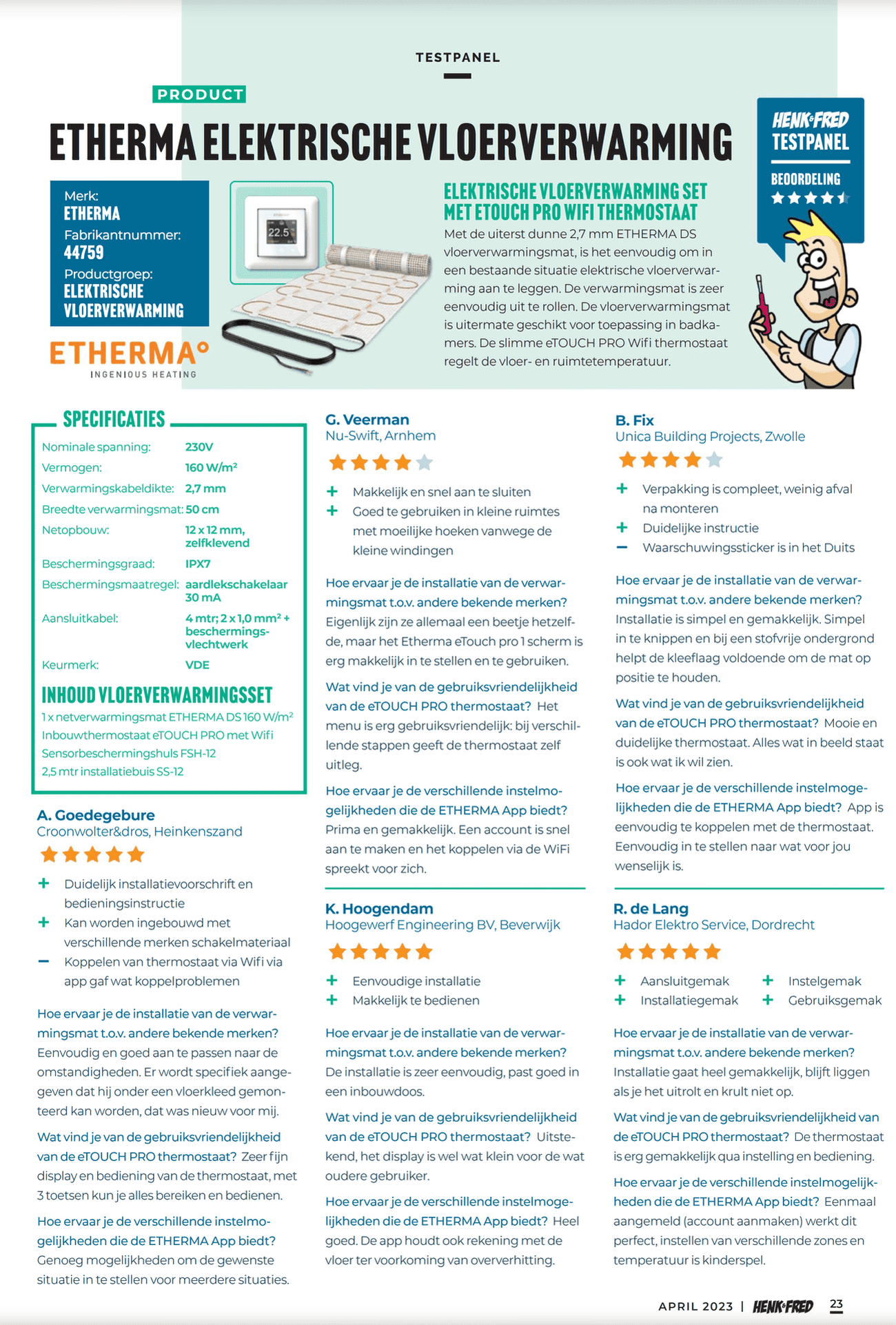 Onlangs hebben vijf installateurs de elektrische vloerverwarming van ETHERMA getest. De resultaten zijn zeer positief. De installateurs waren onder de indruk van de eenvoudige installatie en bediening van de vloerverwarming.