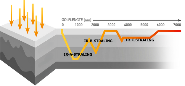Kortgolvige infraroodstraling (IR-A) dringt vanwege de korte golflengte, zoals de naam al aangeeft, zeer snel door de lucht heen, ongeacht de luchttemperatuur, en verwarmt alles wat zich binnen het bereik bevindt: personen, voorwerpen en zelfs muren. Dat verklaart waarom we in de winter ondanks de relatief lage buitentemperatuur in de zon een aangename warmte voelen of tijdens het skiën in de hut zelfs in een trui op het terras kunnen zitten. De zon is namelijk de grootste producent van infraroodstraling. Infraroodstralers maken gebruik van precies dit principe. Infraroodstraling wordt als bijzonder aangenaam ervaren, alsof de zon je kust.