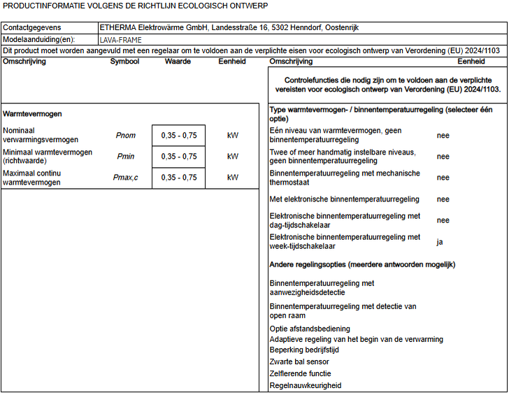 Dit product is een vast, elektrisch verwarmingstoestel voor één ruimte met een nominaal verwarmingsvermogen van meer dan 250 W. Om te voldoen aan de bindende ecodesign-eisen van Verordening (EU) 2024/1103 van de Commissie, moet het worden aangevuld met een regelaar die ten minste de volgende regelingsfuncties vervult: elektronische ruimtetemperatuurregelaar met weekdagregeling (TW) en ten minste één f-functie (bijv. f2, f4 of f8), de volgende combinaties zijn mogelijk: TW (f2), TW (f3), TW (f8)