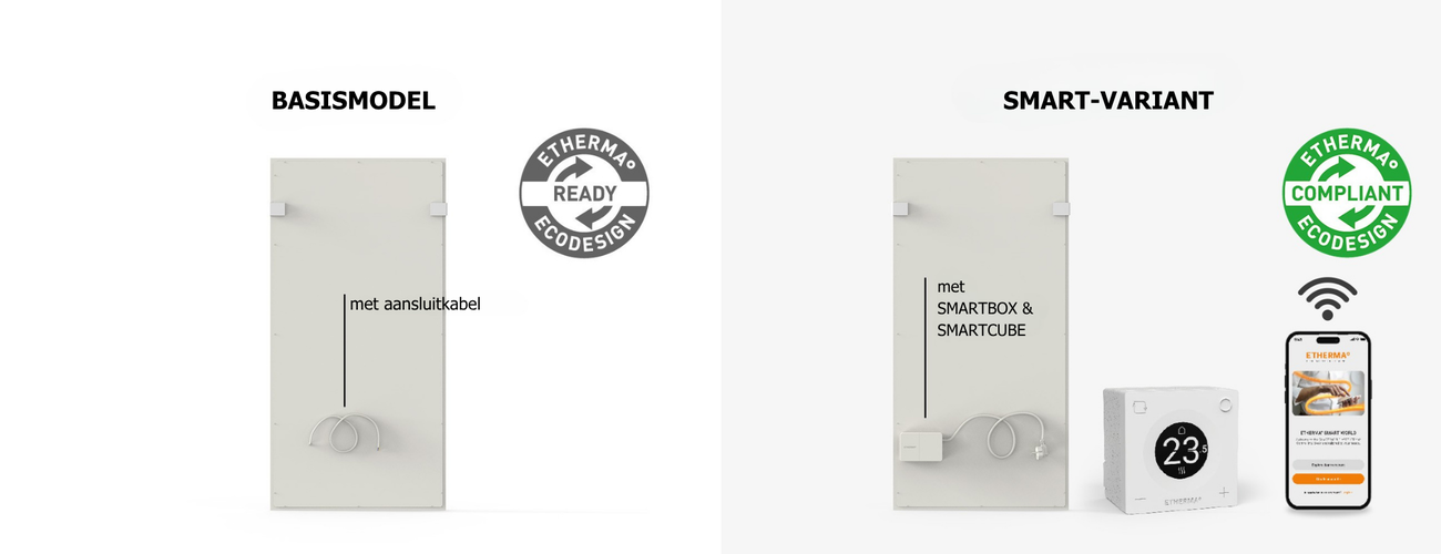 Het basismodel kan op elk moment worden uitgebreid tot de SMART-variant met de SMARTSET, bestaande uit SMARTBOX (radio-ontvanger) en SMARTCUBE (thermostaat). Zo bedient u uw infraroodverwarming comfortabel via de ETHERMA SMART-app via wifi - voor maximale controle, energie-efficiëntie en comfort. -