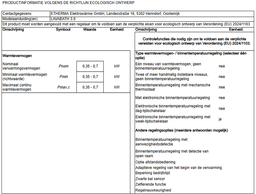 Dit product is een handdoekhouder met een nominaal verwarmingsvermogen van meer dan 250 W. Om te voldoen aan de bindende ecodesign-eisen van Verordening (EU) 2024/1103 van de Commissie, moet het worden aangevuld met een regelaar die ten minste de volgende regelingsfuncties vervult: elektronische ruimtetemperatuurregelaar met weekregeling (TW).