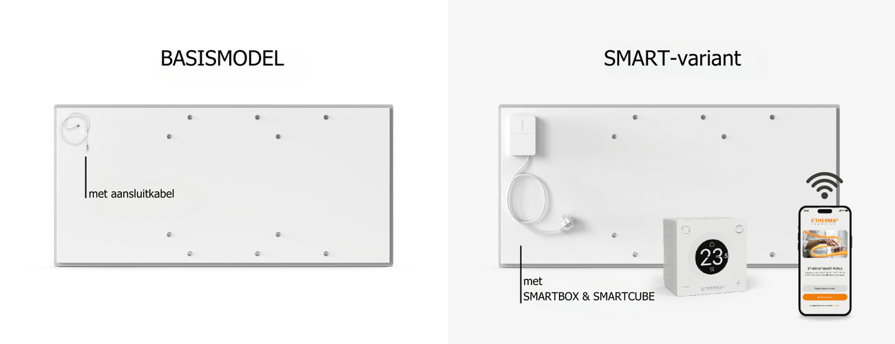 hier is al een SMARTBOX (draadloze ontvanger) aan de achterzijde gemonteerd en wordt de SMARTCUBE (draadloze thermostaat) meegeleverd. Via de ETHERMA SMART-app kunnen de kamertemperatuur, tijdprogramma's, raamdetectie en andere functies comfortabel worden bediend - lokaal of op afstand.