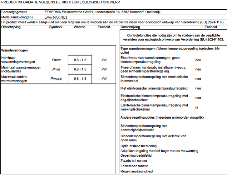 Dit product is een vast, elektrisch verwarmingstoestel voor één ruimte met een nominaal verwarmingsvermogen van meer dan 250 W. Om te voldoen aan de bindende eisen inzake ecologisch ontwerp van Verordening (EU) 2024/1103 van de Commissie, moet het worden aangevuld met een regelaar die ten minste de volgende regelingsfuncties vervult: elektronische ruimtetemperatuurregelaar met weekdagregeling (TW) en ten minste één f-functie (bijv. f2, f4 of f8), de volgende combinaties zijn mogelijk: TW (f2), TW (f3), TW (f8)