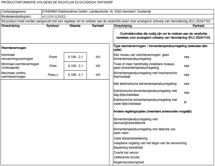 Dit product is een vast, elektrisch vloerverwarmingsapparaat voor één ruimte; om te voldoen aan de bindende ecodesign-eisen van Verordening (EU) 2024/1103 van de Commissie, moet het worden aangevuld met een regelaar die ten minste de volgende regelingsfuncties vervult: elektronische ruimtetemperatuurregelaar met weekregeling (TW) en ten minste één f-functie (bijv. f2 of f4), de volgende combinaties zijn mogelijk: TW (f2), TW (f3), TW (f4), TW (f8)