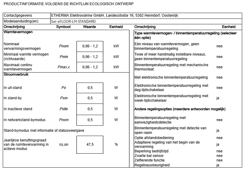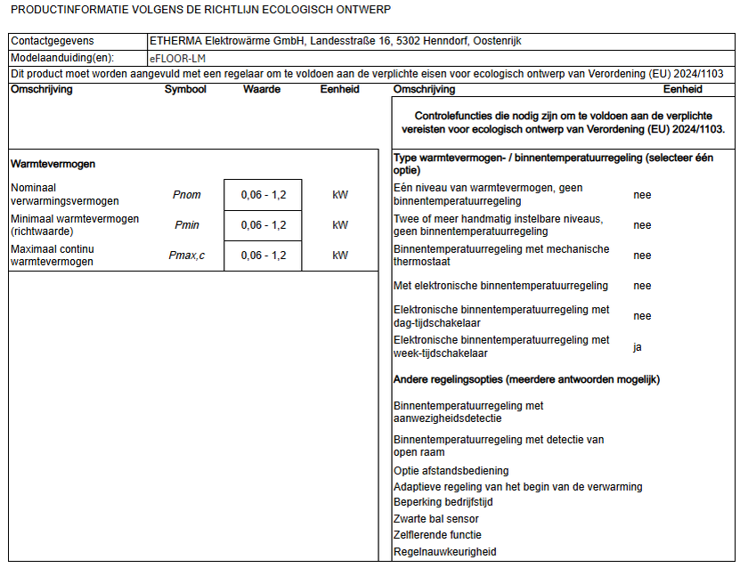 Dit product is een vast, elektrisch vloerverwarmingsapparaat voor één ruimte; Om te voldoen aan de bindende eisen inzake ecologisch ontwerp van Verordening (EU) 2024/1103 van de Commissie, moet het worden aangevuld met een regelaar die ten minste de volgende regelingsfuncties vervult: elektronische ruimtetemperatuurregelaar met weekregeling (TW) en ten minste één f-functie (bijv. f2 of f4), de volgende combinaties zijn mogelijk: TW (f2), TW (f3), TW (f4), TW (f8)