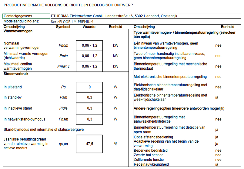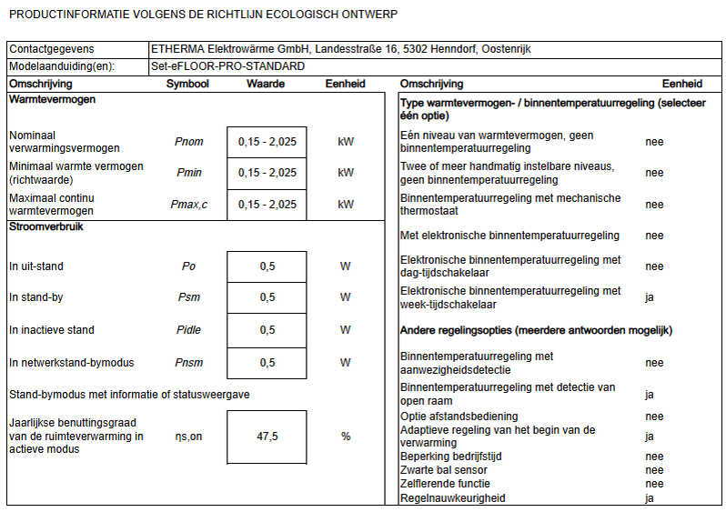 Dit product is een vast, elektrisch vloerverwarmingsapparaat voor één ruimte; om te voldoen aan de bindende ecodesign-eisen van Verordening (EU) 2024/1103 van de Commissie, moet het worden aangevuld met een regelaar die ten minste de volgende regelingsfuncties vervult: elektronische ruimtetemperatuurregelaar met weekregeling (TW) en ten minste één f-functie (bijv. f2 of f4), de volgende combinaties zijn mogelijk: TW (f2), TW (f3), TW (f4), TW (f8)