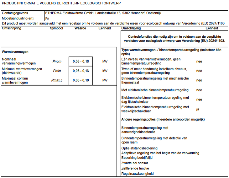Dit product is een vast, elektrisch vloerverwarmingsapparaat voor één ruimte; om te voldoen aan de bindende ecodesign-eisen van Verordening (EU) 2024/1103 van de Commissie, moet het worden aangevuld met een regelaar die ten minste de volgende regelingsfuncties vervult: elektronische ruimtetemperatuurregelaar met weekregeling (TW) en ten minste één f-functie (bijv. f2 of f4), de volgende combinaties zijn mogelijk: TW (f2), TW (f3), TW (f4), TW (f8)