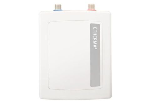 De ETHERMA AQUA WHM is een hydraulisch gestuurde doorstroomboiler in klein formaat. Deze doorstroomboiler is perfect te gebruiken bij een wastafel. Zodra er warm water wordt gevraagd, schakelt de doorstroomboiler automatisch in. Het water wordt volledig elektrisch verwarmd. Deze doorstroomboiler is te klein om te gebruiken voor het douchen. De doorstroomboiler is verkrijgbaar in 2 vermogens: tot 3,5 kW en tot 5,5 kW. De kleine uitvoering van 3,5 kW past op 1 stroomgroep. De 5,5 kW uitvoering dient aangesloten te worden op een kookgroep 2 x 16A. Door zijn kleine formaat kan de elektrische doorstroomboiler direct onder de wastafel worden geplaatst.